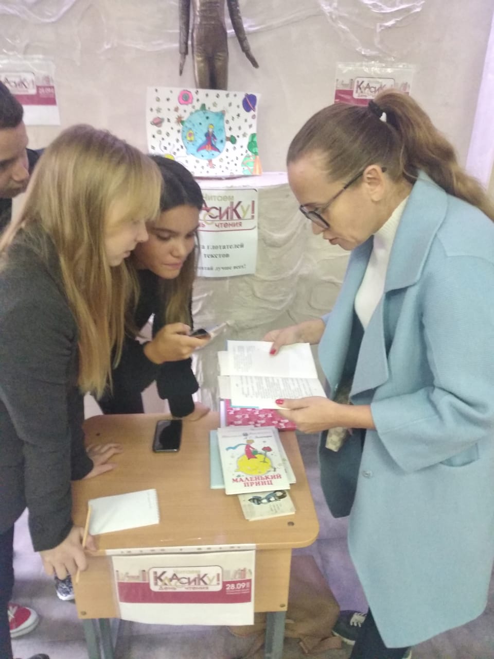 В фойе гимназии, в преддверии Городского конкурса чтецов «Лига Глотателей текста», дежурный 9-б класс вместе с классным руководителем А.А. Пашковой провели школьный полумарафон чтецов. Каждому участнику предлагалось прочитать 21,5 строку (соответственно количеству километров в полумарафонской дистанции) – отрывок из книги «Маленький Принц», написанной настоящим писателем - мечтателем Антуаном де Сент-Экзюпери. Книга была выбрана не случайно, ведь тема года в Корифее – «Мастерская мечты»! Прочитать свой отрывок нужно было не просто быстро, но и выразительно, а также без ошибок. В конкурсе приняли участие чтецы разного возраста: ученики 2-11 классов, учителя и даже родители! Среди гимназистов начальной школы победителем стала ученица 2-а класса Таисия Ступичева. Она прочитала отрывок текста за 1 минуту 11 секунд.В среднем звене лучшими признаны: Алиса Карась, 8-а (30 секунд) и Аня Мясникова, 5а (приз за выразительность и решительность). Среди участников 9-11 классов отличились Виктор Масленников, 11-б (38 секунд) и Игорь Корабельников (приз за юмор). Среди учителей с победой можно поздравить учителя литературы Л. В. Баженову (30 секунд), среди представителей администрации - М.А. Горочкину (приз за качественное чтение), а среди родителей – М.М. Сомову (25 секунд), прочитавшей отрывок быстрее всех, принявших участие в полумарафоне!