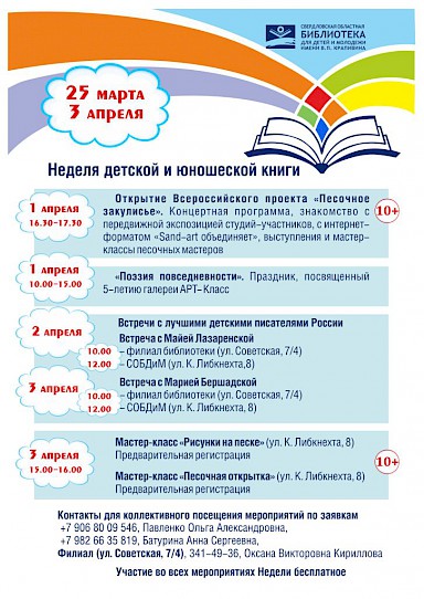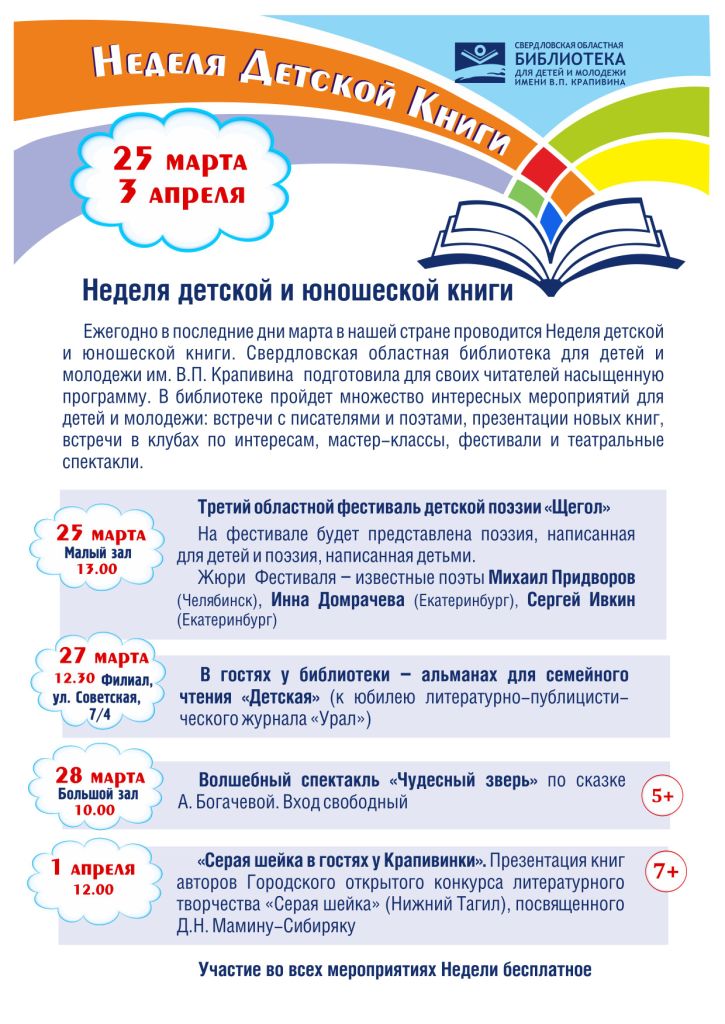 С 25 марта по 3 апреля в рамках Недели детской книги в Свердловской областной библиотеке для детей и молодежи им. В.П. Крапивина пройдет ряд интереснейших мероприятий, среди которых творческие встречи с писателями и поэтами, театральные постановки, фестивали, встречи клубов по интересам и многое другое. Все мероприятия бесплатные. На них можно прийти самому или с родителями или даже всем классом, согласовав предварительно заявку с организаторами.