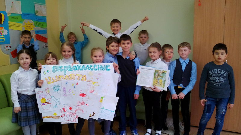 Ребята из первого класса окунулись в мир зверей вместе с книгой Геннадия Цыферова. С помощью сказок о цыпленке ребята превратились в желтеньких маленьких пушистых комочков. Ученики читали друг другу интересные истории о цыпленке и его друзьях, о первых удивлениях и грустных днях, а затем все дружно изображали зверей из сказок. Каждый пытался нарисовать самое запоминающееся явление из сказки: синее солнце понедельника, радугу, воздушного змея или пасмурную тучку. Все рисунки объединились в одну красочную стенгазету, которую назвали "Первоклассные цыплята".