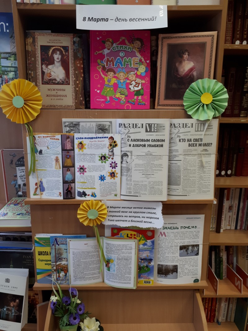 В первый день весны и в честь наступающего 8 марта в библиотеке гимназии оформлена выставка "8 Марта - день весенний". На выставке читатели смогут найти сборники стихов о весне, о празднике и о тех, для кого 8 марта расцветают все цветы - о прекрасных дамах. Также здесь есть собрание идей для проведения классных мероприятий, посвященных этому дню.