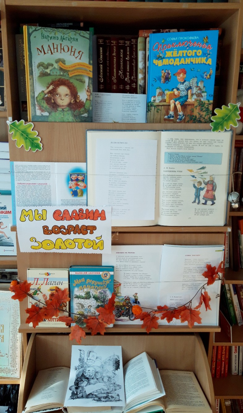 В этот день в библиотеке гимназии оформлена книжная выставка «Мы славим возраст золотой». На выставке представлены произведения известных писателей о людях "золотого" возраста, а также стихи, посвящённые бабушкам и дедушкам.