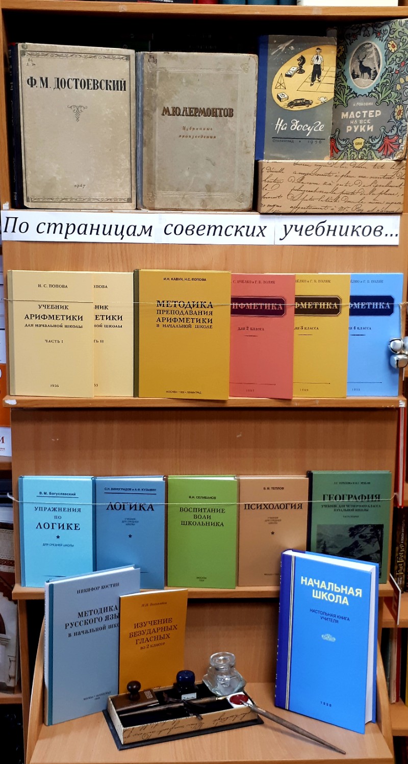 На нашей выставке представлены учебники по арифметике, русскому языку, географии, а также логике, психологии, воспитанию школьников. Можно познакомиться с методиками преподавания русского языка и арифметики в начальной школе. А обществоведов наверняка заинтересуют учебники логики 50-х годов для старшеклассников.