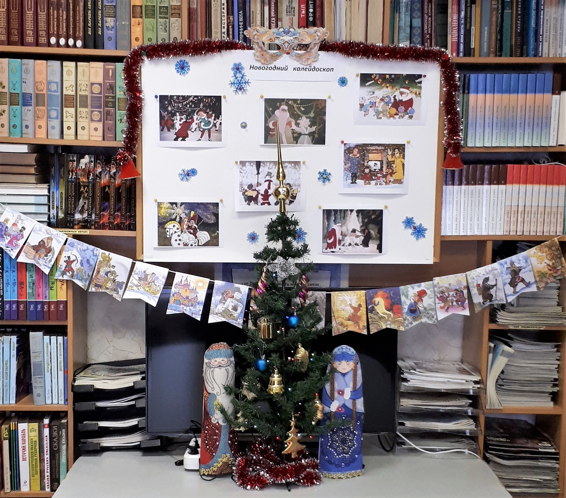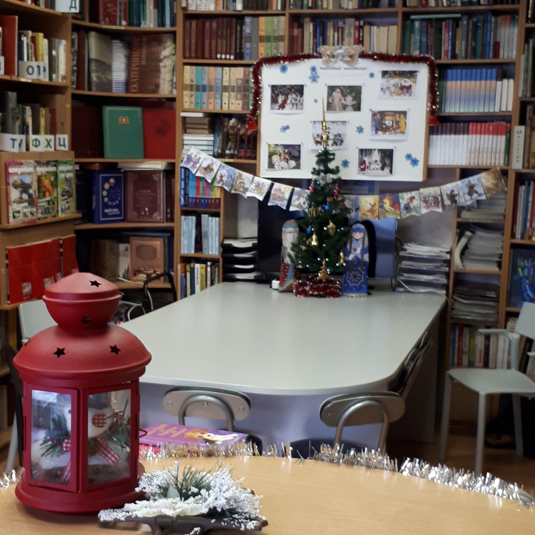 Скоро-скоро наступит Новый год. Подготовка к нему идет полным ходом. Репетируются новогодние спектакли, спешно украшаются кабинеты и коридоры. Везде зажигаются огни, сверкает мишура, блестят новогодние игрушки. Не осталась в стороне от праздничной суеты и наша школьная библиотека. В ожидании праздника читальный зал украсился новогодней атрибутикой - на столе стоит елка с Дедом Морозом и Снегурочкой, горит рождественский фонарь, а у окна пролетают волшебные снежинки.